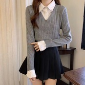 レディース 重ね着風 ドッキングニット シャツ襟切り替え ニットブラウス カジュアルニットソー 春秋冬ニットプルオーバー